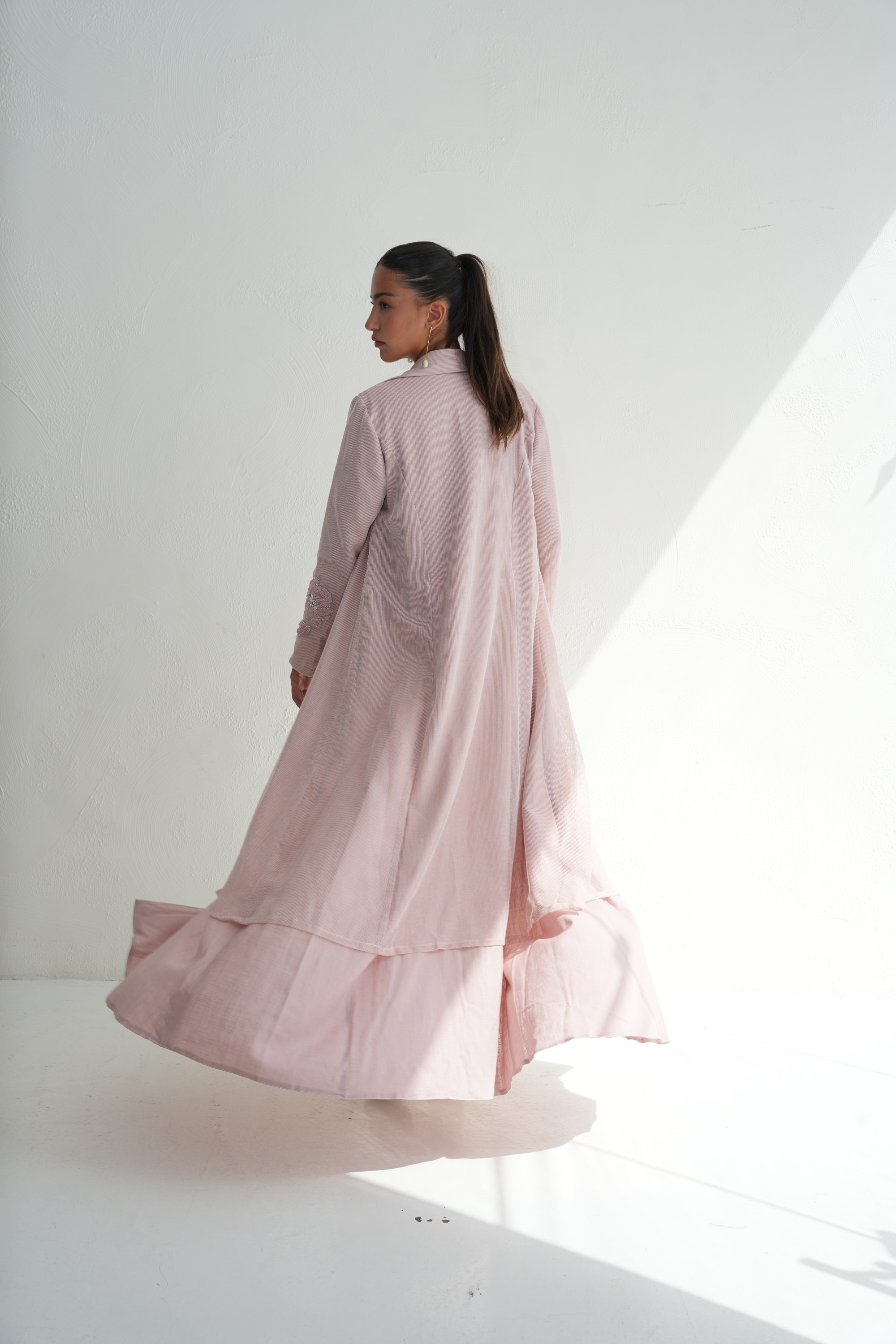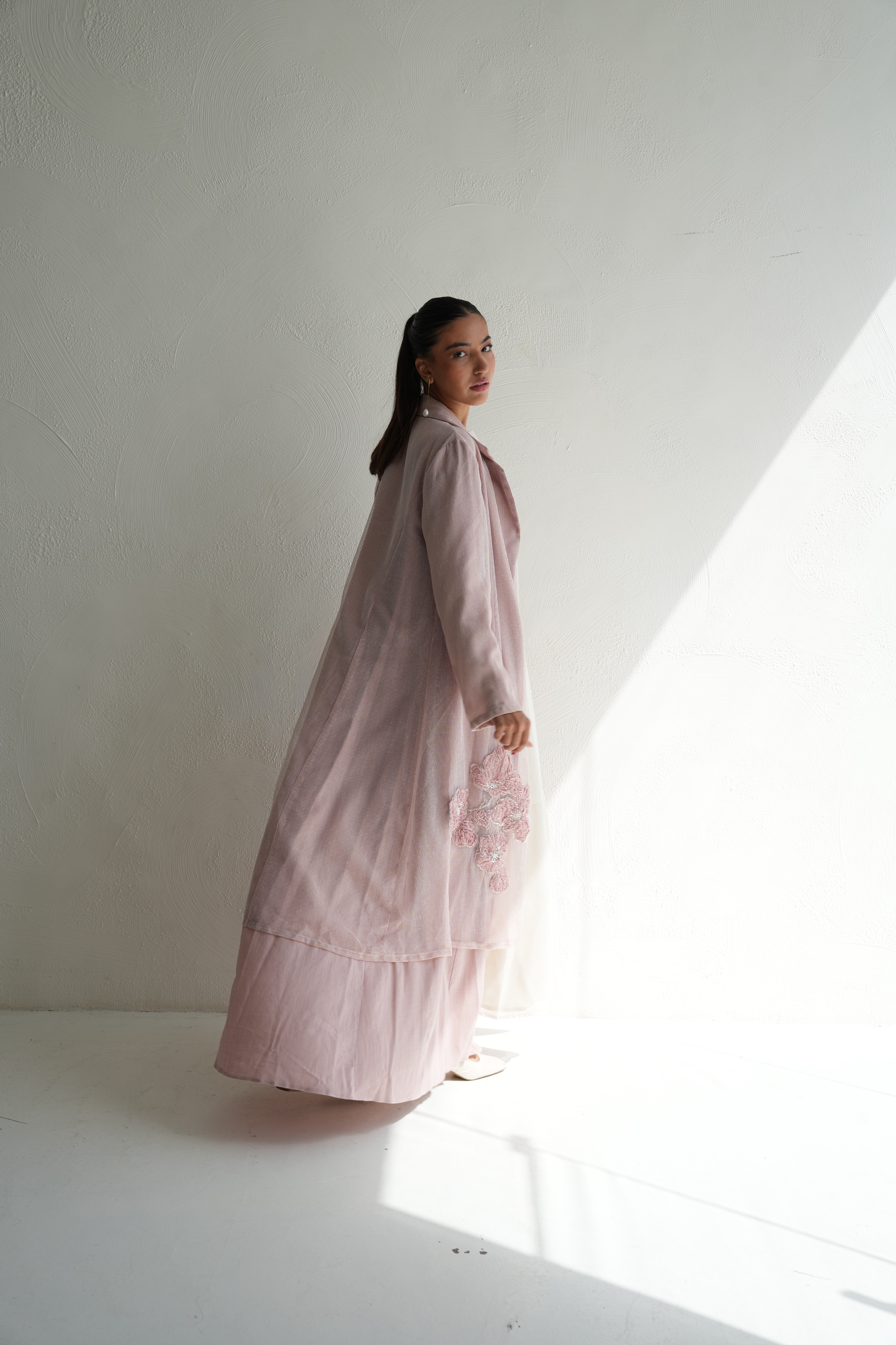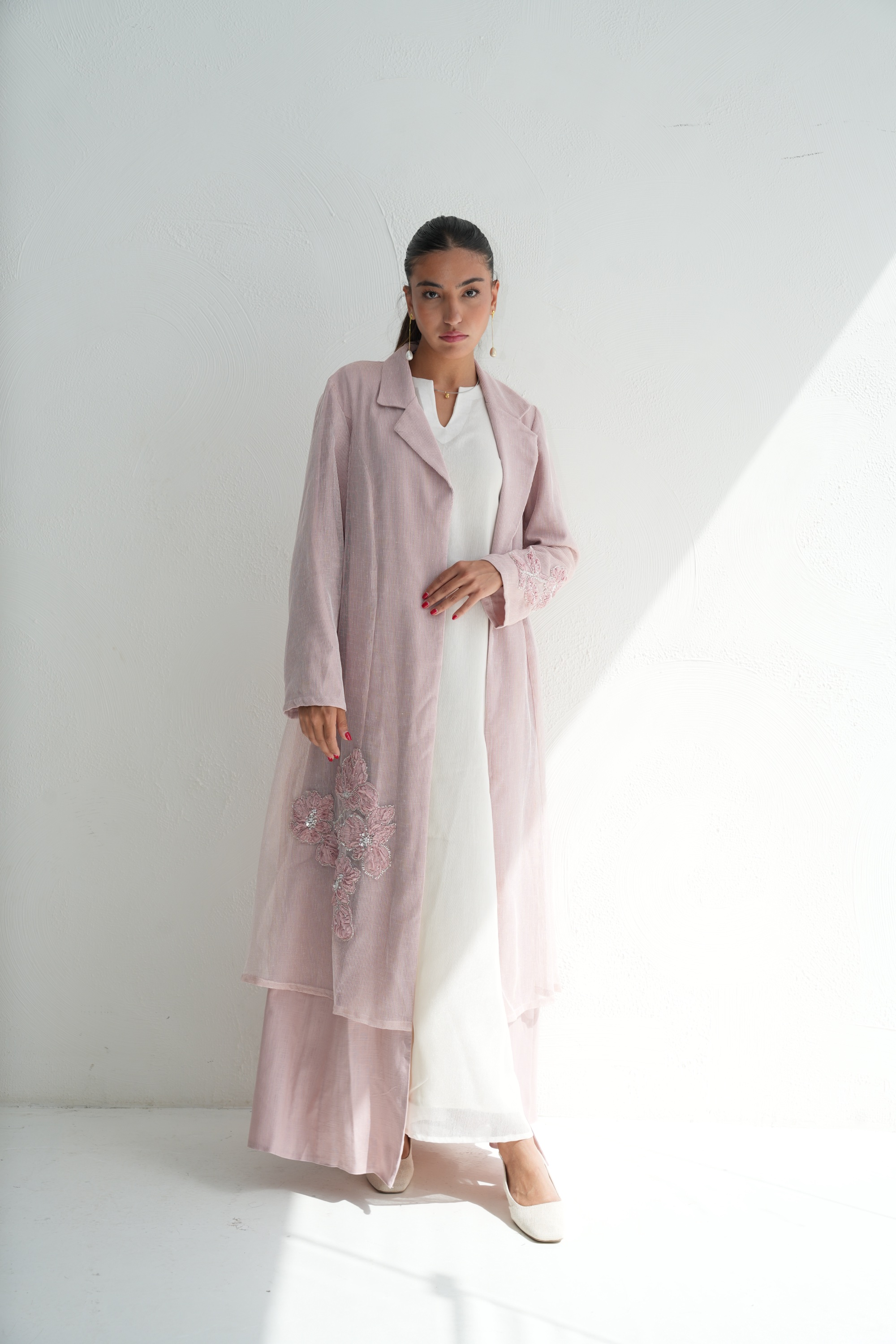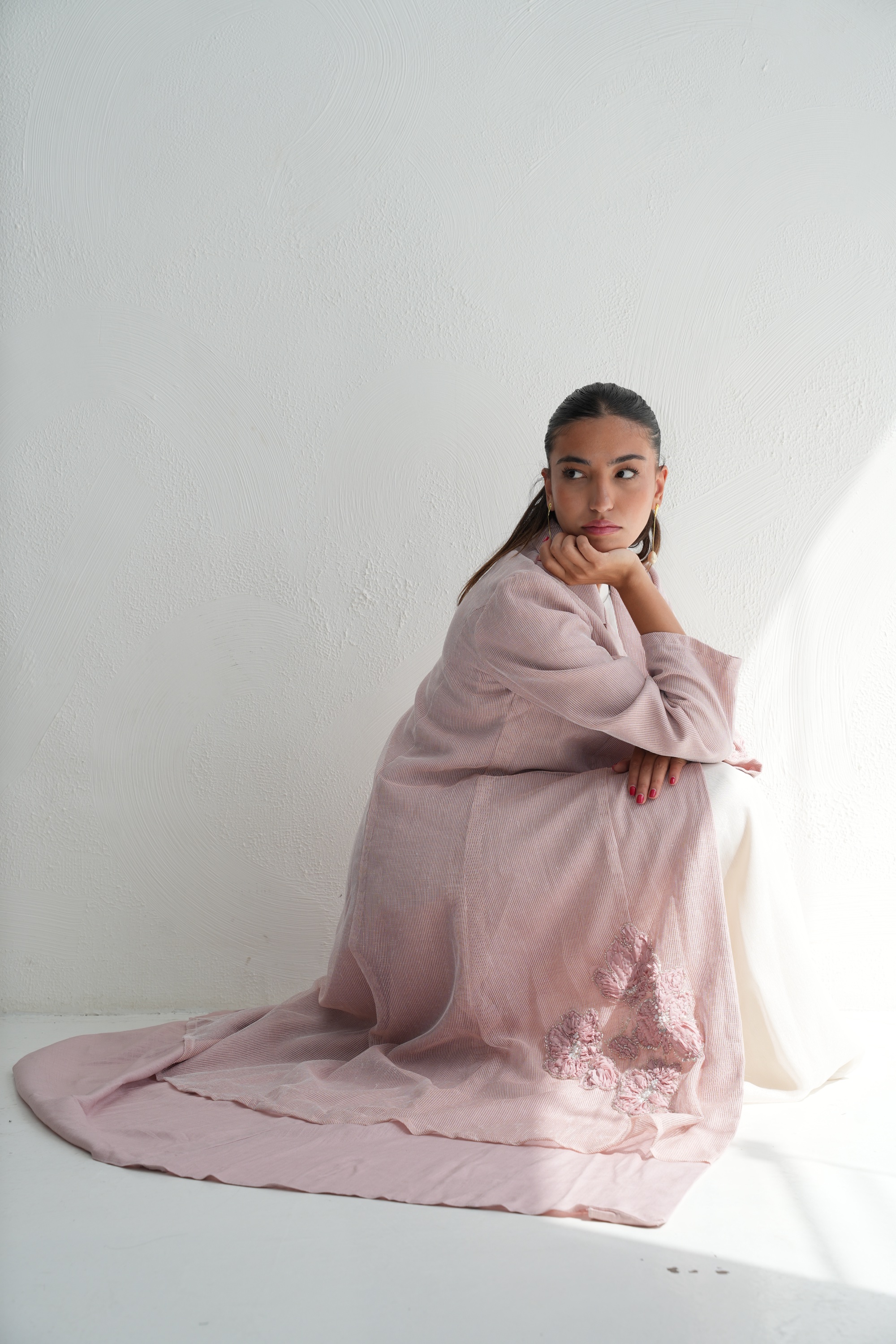 The Ivory Dusk Abaya Abaya is a stunning piece that effortlessly combines elegance and charm. Crafted in a soft pink fabric, it features intricate tulle detailing with exquisite floral embellishments gracefully adorning the bottom. Perfect for special occasions, this abaya blends tradition with contemporary style, ensuring you stand out with its unique design and luxurious appeal.