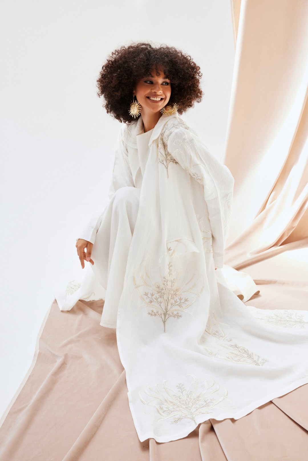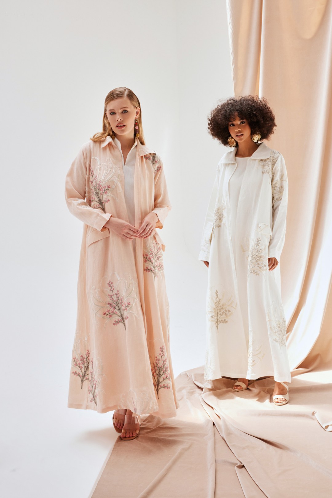 White Nour Abaya With Pockets & Pastel Shaded Flower Embroideries